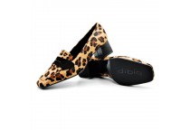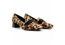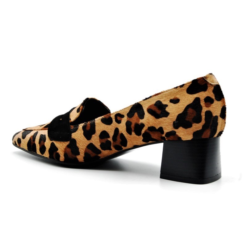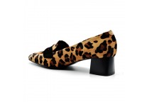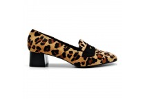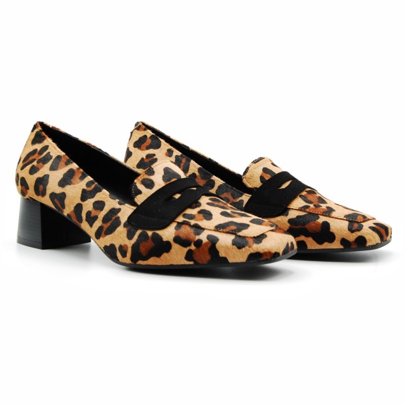 Zapato mocasin con tacón ancho de Dibia en piel imitando el leopardo en color camel y negro. Zapatos para mujeres con looks más casual, urbanos y desenfadados, pero siempre con estilo.